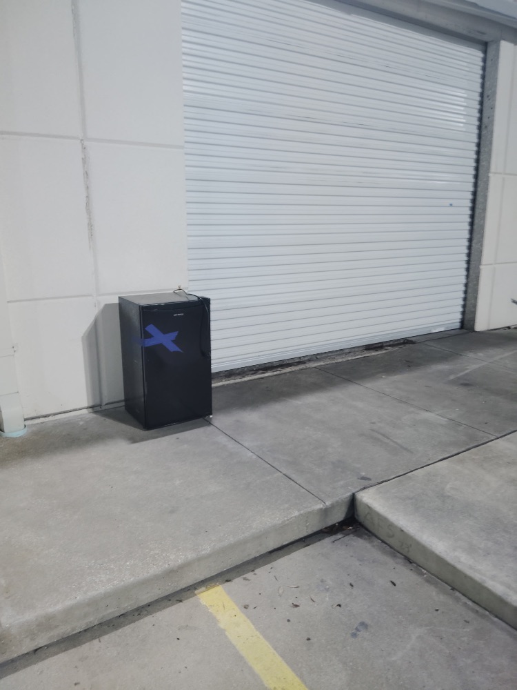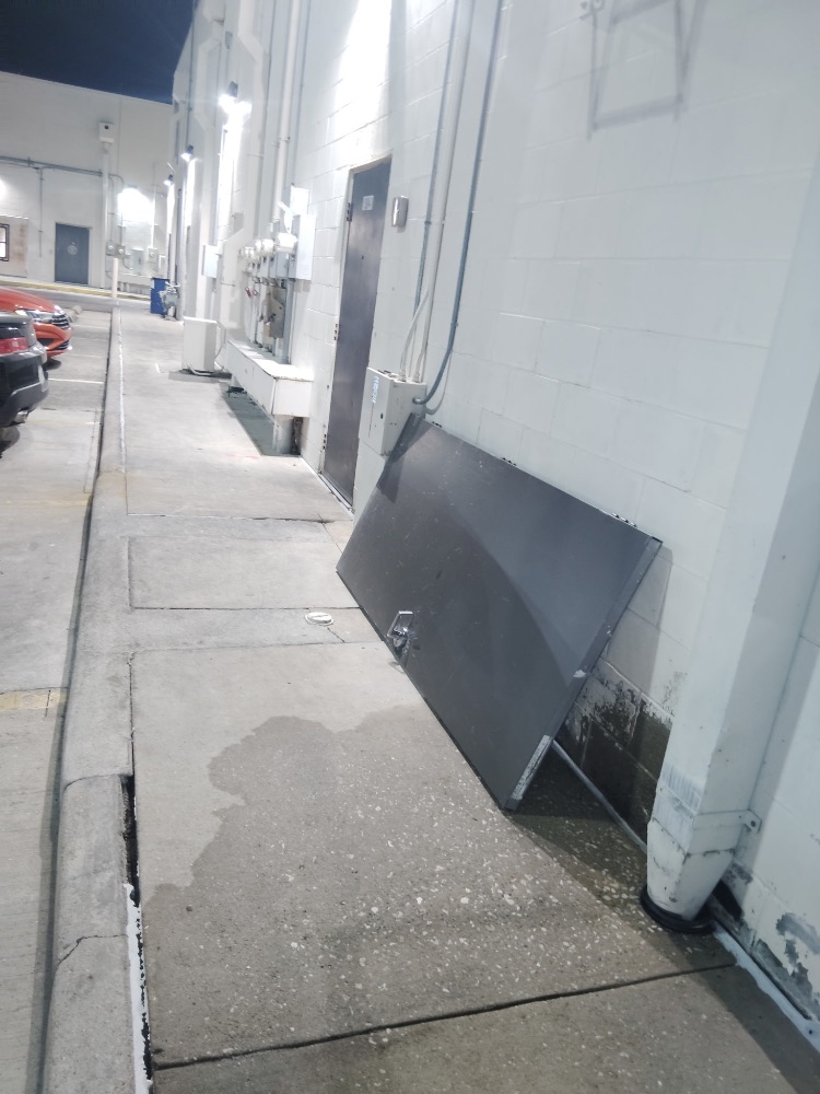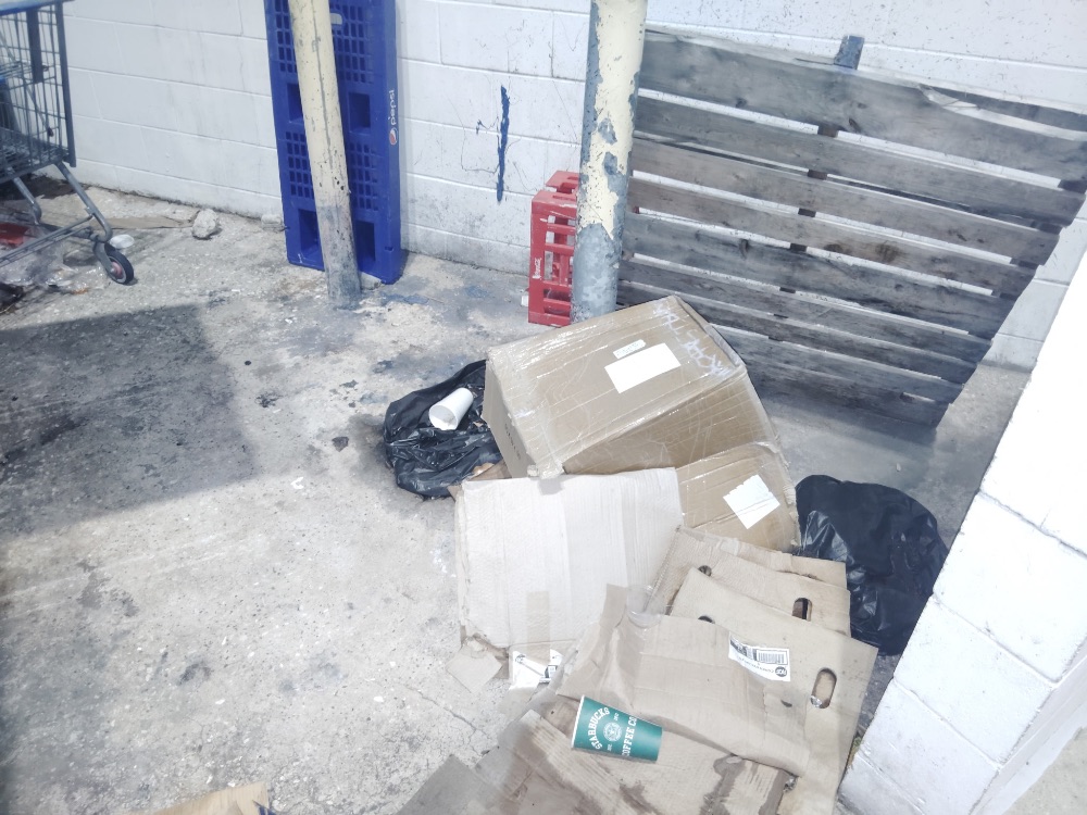 The crew reported extensive illegal dumping at the back of Briarwood (Phase 1). Near Starbucks, various items including cardboard boxes, construction debris, and discarded bollards were found by the dumpster and wall. A wooden pallet and numerous trash bags were also present. Closer to Tacos Tec, a large panel and a black mini-fridge were illegally dumped against the building wall and on the sidewalk.