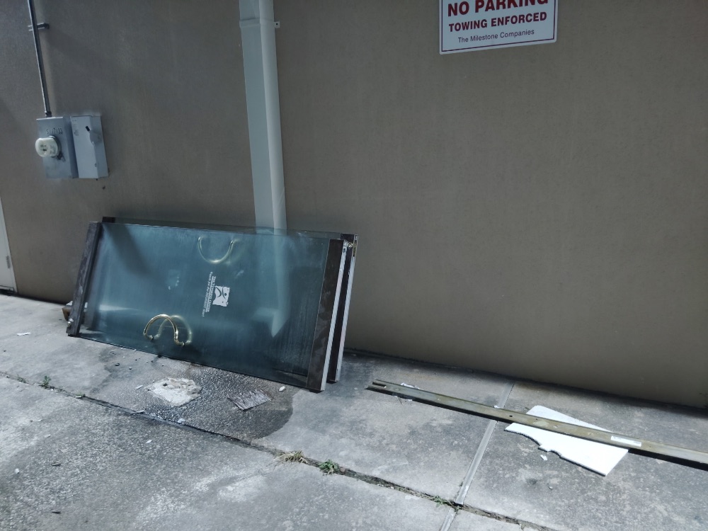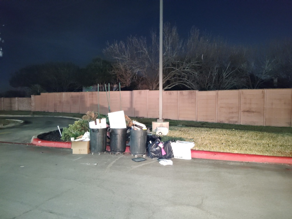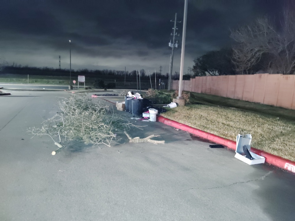 The crew observed extensive illegal dumping at the Crestwater property. At the front, near Kroger, a mattress, armchair, and other household debris were left by the donation bins. At the back, by Burbon St. Daiquiries, piles of tree branches, cut wood, and various household items were found. Near Subway, a large glass panel, metal bar, and foam appeared to be discarded commercial waste. Additional trash bags, cardboard, and a large shrub were also noted overflowing bins at the back.