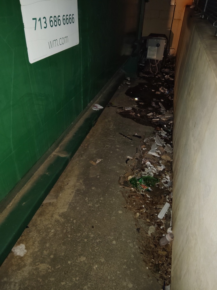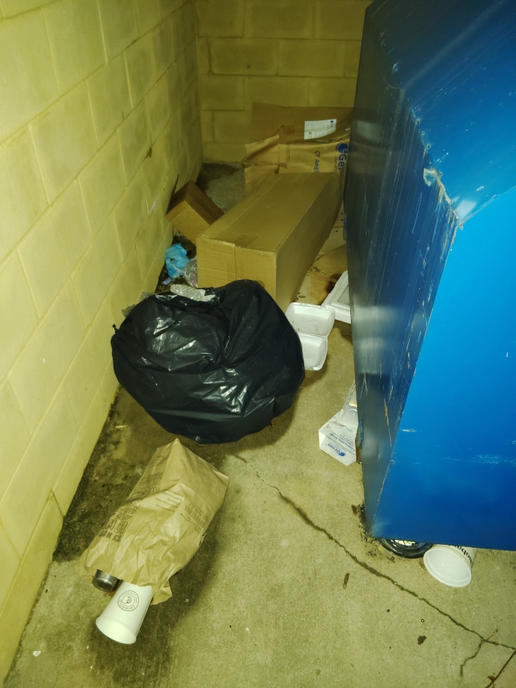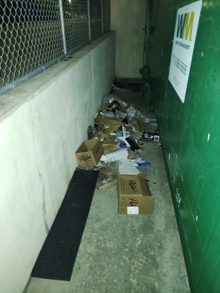 | The crew observed extensive illegal dumping at the back of Shoppes at Parkwest. Near Golf Galaxy, several wooden pallets, cardboard boxes, and various trash, including liquid waste, were found improperly discarded. Closer to Simon Med Imaging, numerous trash bags, broken furniture, and food waste were illegally dumped around the dumpster areas. |