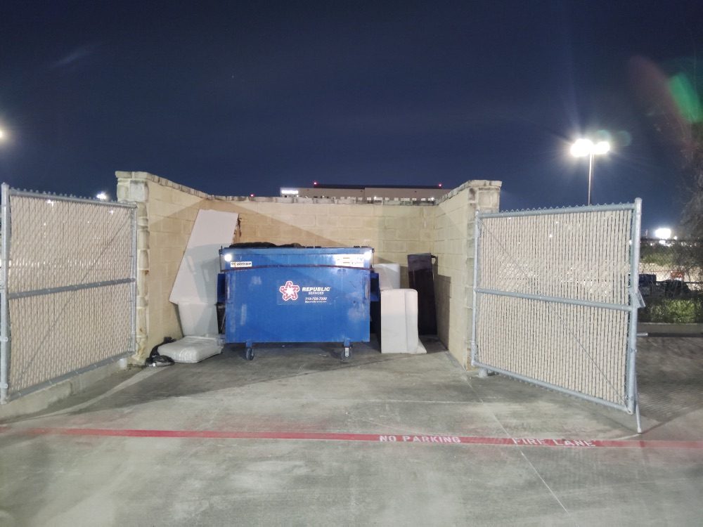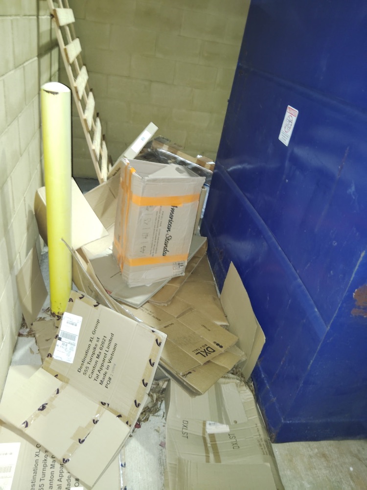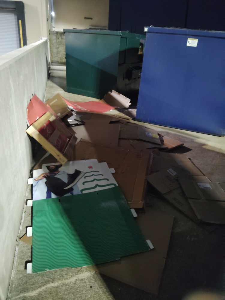 The crew observed extensive illegal dumping at the Shoppes at Parkwest. Behind DXL, pallets, a broken toilet, and trash were found next to the recycling dumpster, along with a large pile of commercial cardboard boxes. Behind Simon Med Imaging, bulky debris and discarded furniture were left around the dumpster enclosure. Numerous flattened cardboard boxes and retail display materials were also dumped on the ground behind Petsmart.