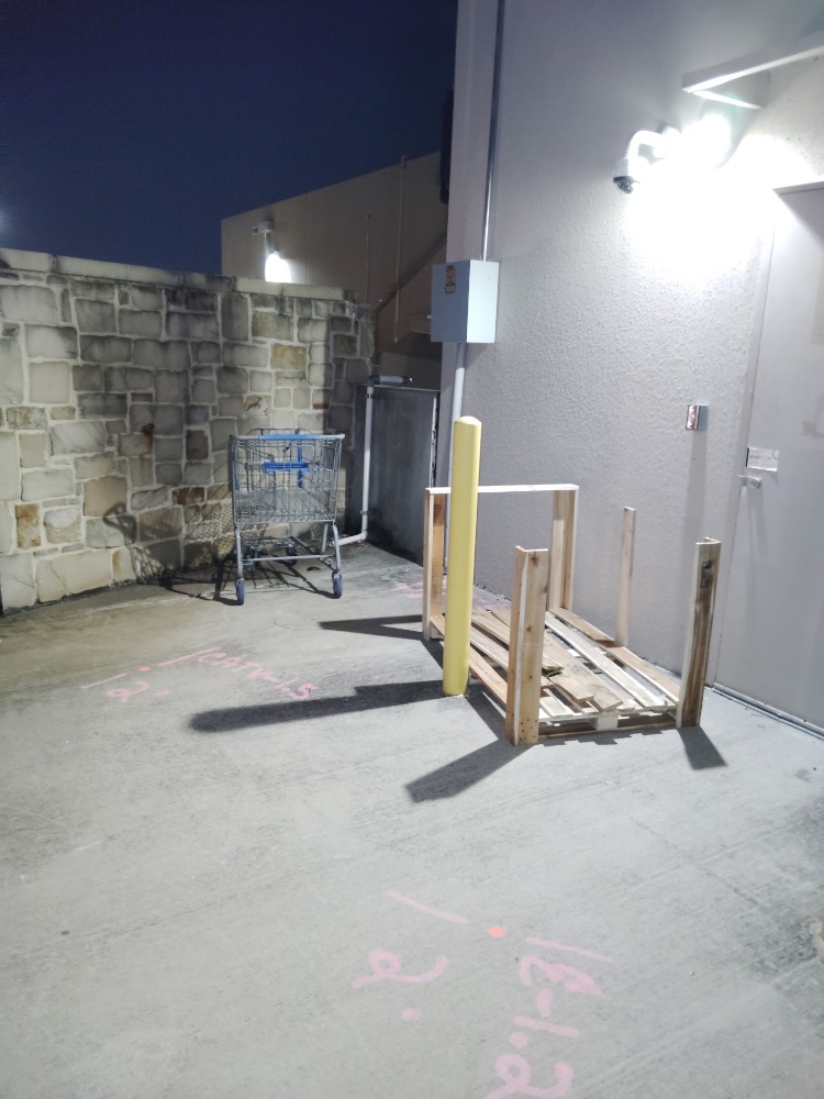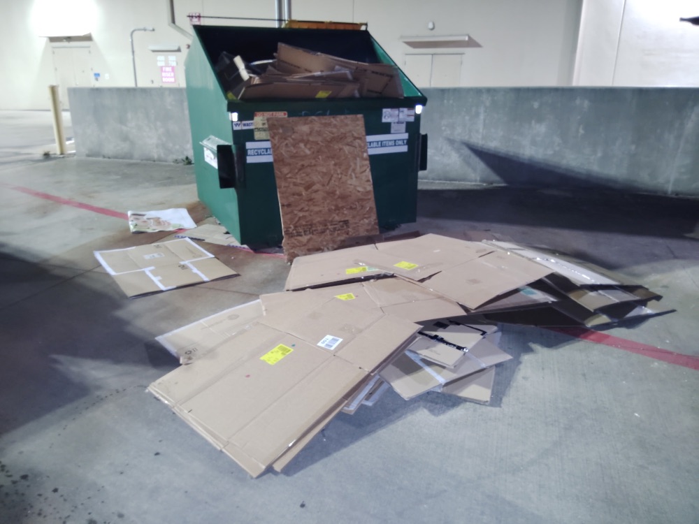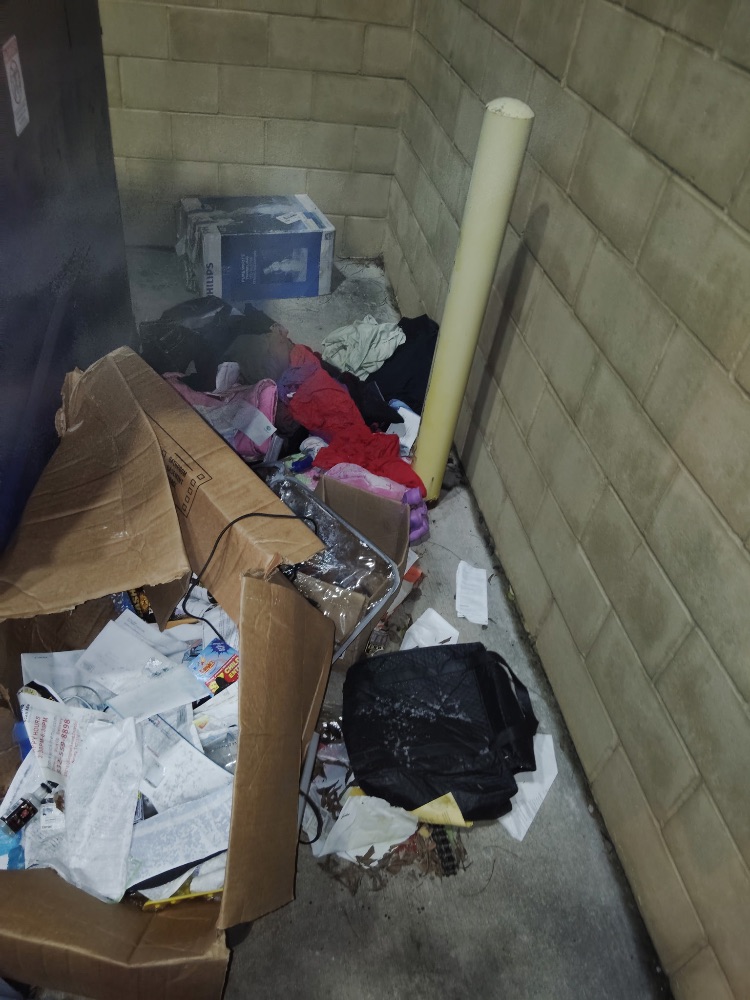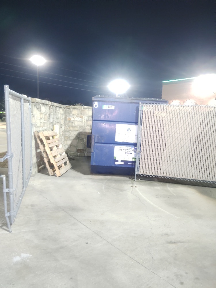 The crew observed extensive illegal dumping at the back of Shoppes at Parkwest. Various items were found, including household trash, large appliance boxes, clothing, and construction-like debris near DXL, Ross, Chipotle, and Dicks House of Sports. Numerous wooden pallets were also discarded against walls and near dumpsters, contributing to significant clutter around the property’s service areas.