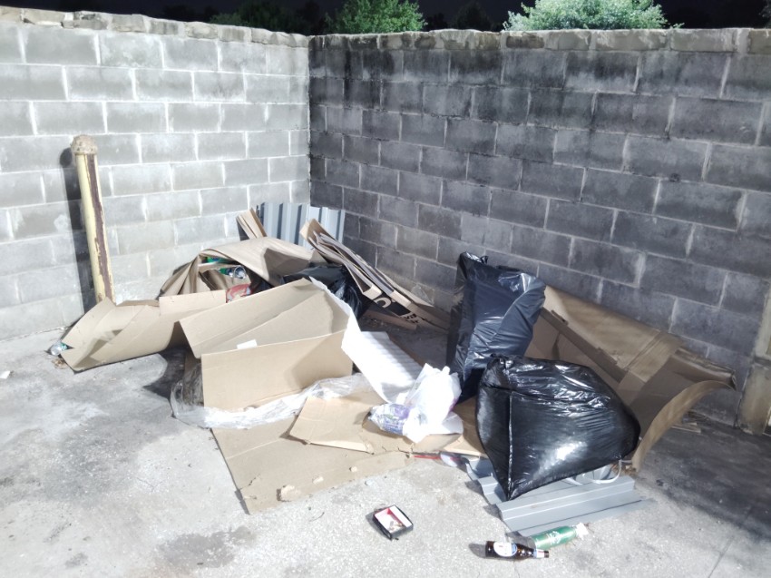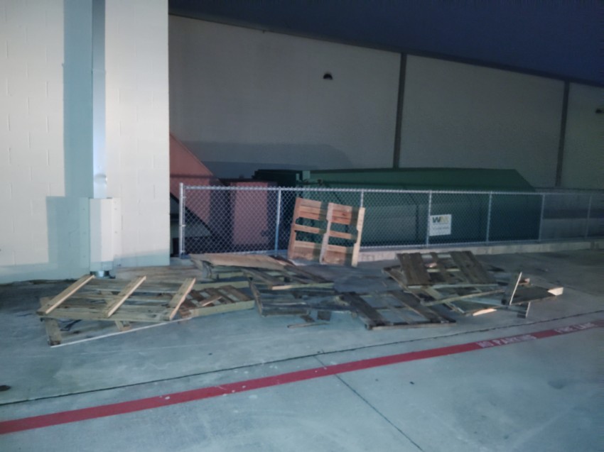 The crew reported several pallets and trash left inside the enclosure next to abuelo’s. There are some wooden pallets left on the back and on the front of abuelo’s. More discarded wooden pallets and frames were leaning against shipping containers behind Dicks House of Sports, with additional broken pallets and debris scattered around a service area. Behind Simon Med Imaging, a pallet and multiple bags of trash were left outside the dumpster.