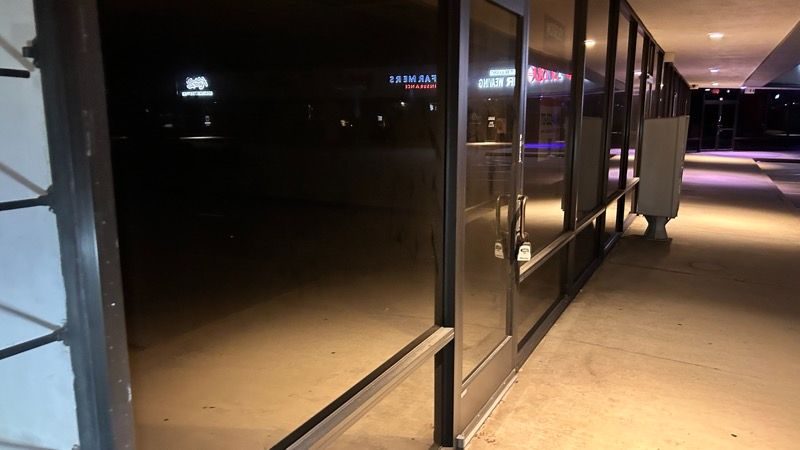 Stop sign or wrecker sign missing from entrance near Spring Creek Forest Vacant space windows need cleaning